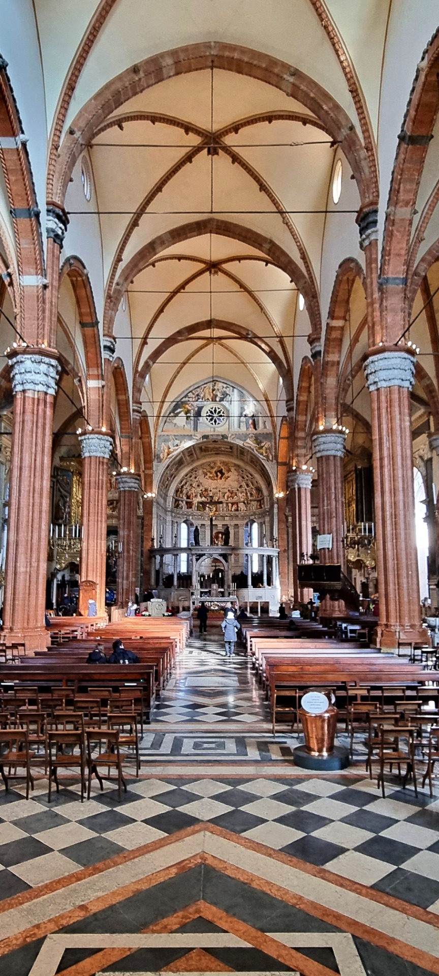 V Duomo di Verona nás na první pohled zaujme před presbytářem umístěná půlkruhová renesanční pergola se sloupky s iónskými hlavicemi, nad jejímž středovým vstupním obloukem je Ukřižovaný Kristus. Pergola tak opticky odděluje prostor kostela s moderním obětním stolem od presbytáře s původním oltářem.