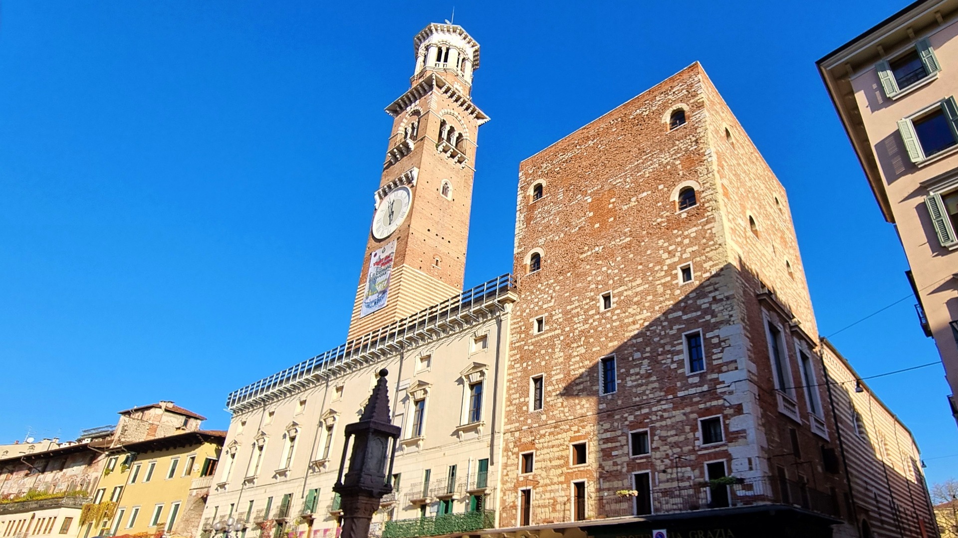 Dominantou Piazza delle Erbe je věž Torre dei Lamberti postavená v r. 1172 rodinou Lamberti. Ale, nebojte - šlapat pěšky po 368 schodech do výšky 84 metrů nemusíme. Na vyhlídku jezdí výtah.